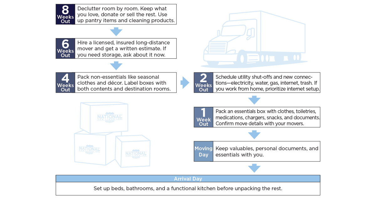 Whether you’re relocating solo, moving with a partner, raising a family, or traveling with pets, the process can feel huge. At National Van Lines, we’ve helped thousands of people make successful long-distance moves for nearly a century. This guide will give you handy visuals and tips so you can break the process down into clear, manageable steps.